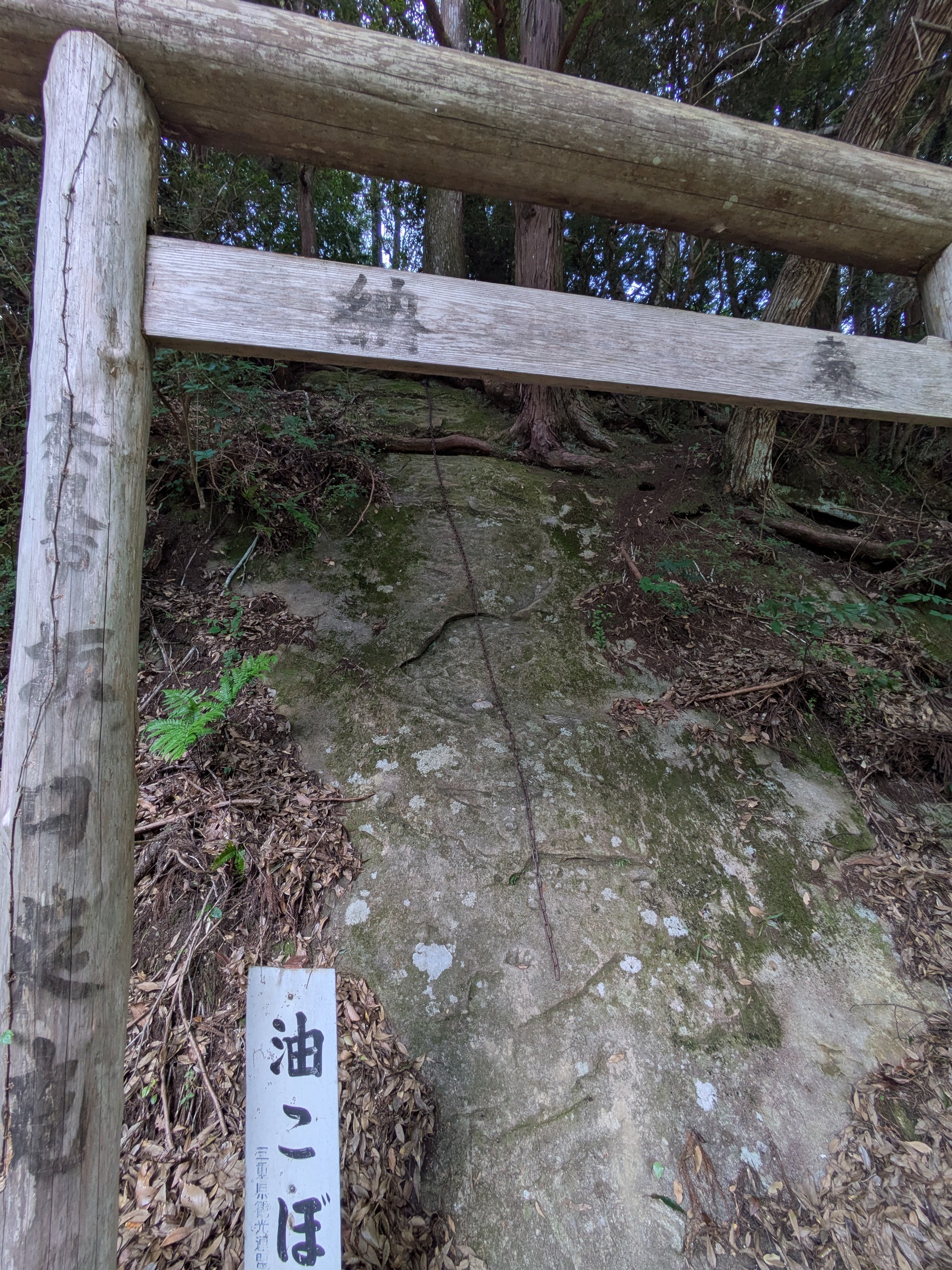 鳥居の目の前は、もう一つの油こぼし、さっそく鎖場です。