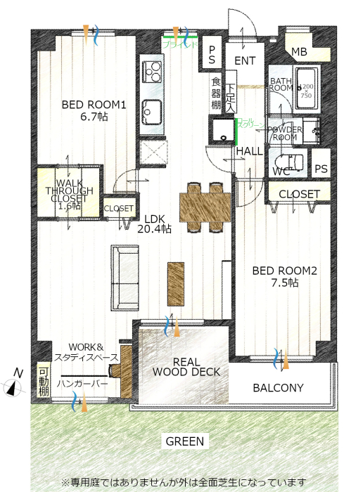 専有面積 | 72.4u | 間取り | 2LDK (LDK20.4/洋室7.5/洋室6.7) | ||