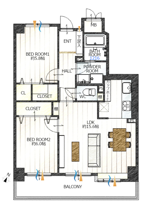 専有面積 | 66.17u | 間取り | 2LDK (LDK15.6/洋室6/洋室5.8) | ||