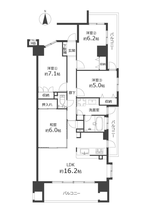 専有面積 | 91.29u | 間取り | 4LDK (LDK16.2/洋室7.1/洋室6.2/洋室5/和室6) | ||