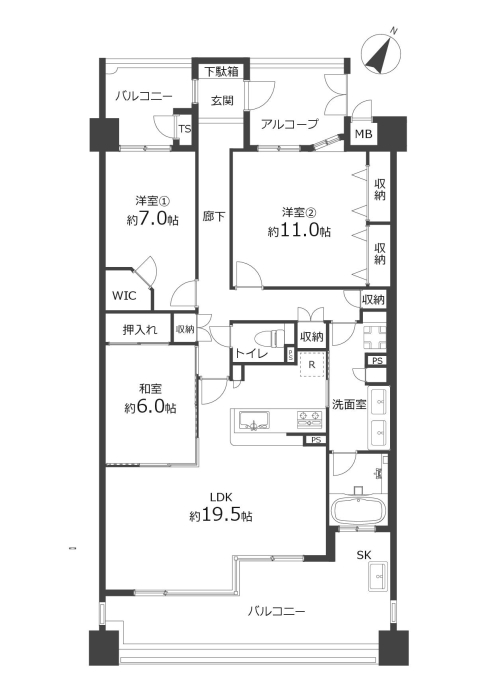 専有面積 | 105.59u | 間取り | 3LDK (LDK19.5/洋室11/洋室7/和室6) | ||
