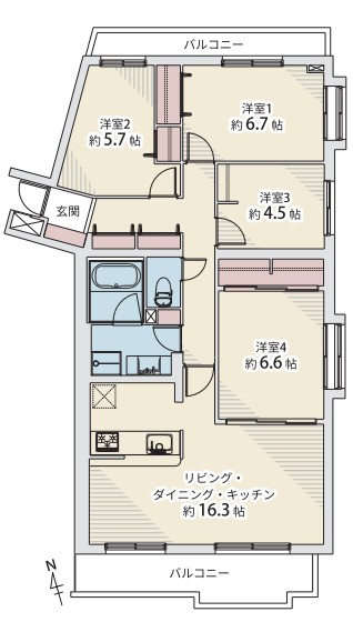専有面積 | 89.96u | 間取り | 2LDK (LDK16.3/洋室6.7/洋室6.6/洋室5.7/洋室4.5) | ||