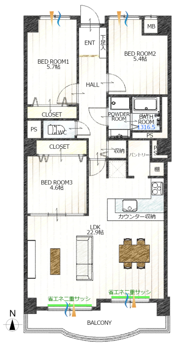 専有面積 | 84.93u | 間取り | 3LDK (LDK22.9/洋室5.7/洋室5.4/洋室4.6) | ||