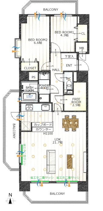 専有面積 | 80.43u | 間取り | 2SLDK (LDK21.7/洋室6.6/洋室4.3/その他2.5) | ||