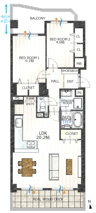 専有面積 | 69.16u | 間取り | 2LDK (LDK20.2/洋室6.1/洋室4.6) | ||