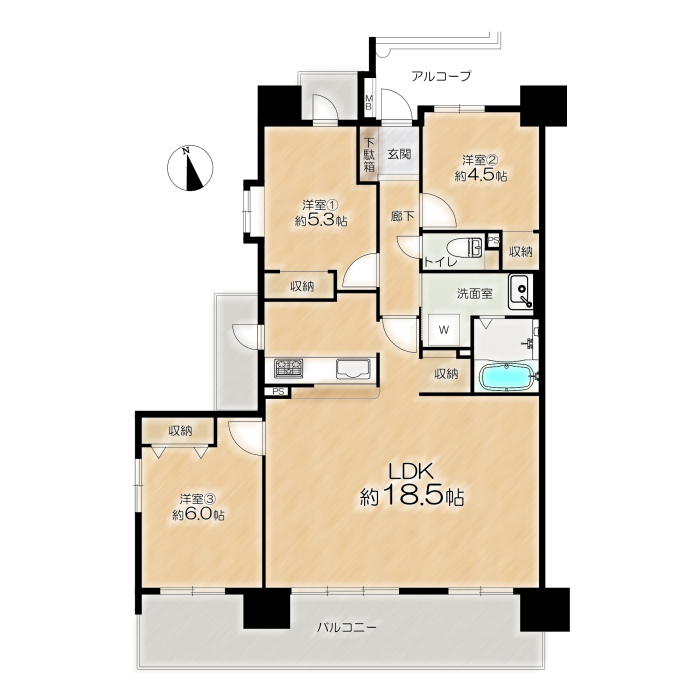 専有面積 | 78.74u | 間取り | 3LDK (LDK18.5/洋室6/洋室5.3/洋室4.5) | ||