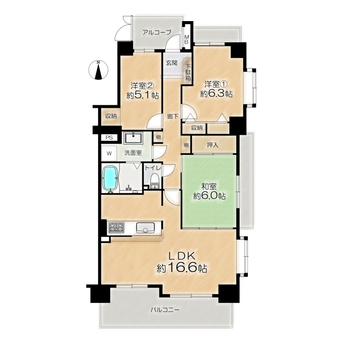 専有面積 | 77.72u | 間取り | 3LDK (LDK16.6/洋室6.3/洋室5.1/和室6) | ||
