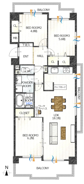 専有面積 78.28u 間取り 3LDK (LDK18.1/洋室6.2/洋室5.6/洋室4.8)