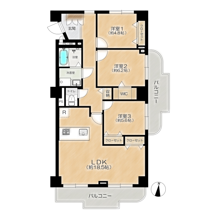 専有面積 | 81.06u | 間取り | 3LDK (LDK18.5/洋室6.2/洋室5.6/洋室4.8) | ||