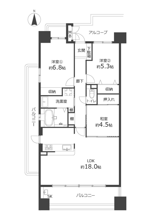 専有面積 | 78.83u | 間取り | 3LDK (LDK18/洋室6.8/洋室5.3/和室4.5) | ||
