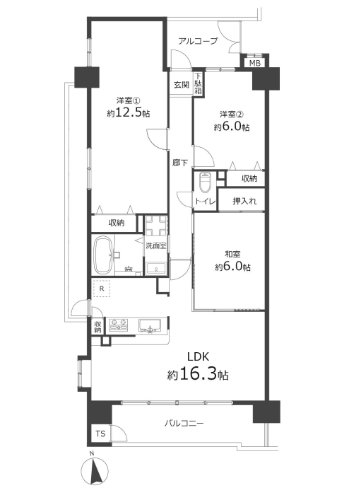 専有面積 86.1u 間取り 3LDK (LDK16.3/洋室12.5/洋室6/和室6)