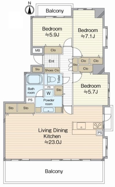 専有面積 | 96.02u | 間取り | 3LDK (LDK23/洋室7.1/洋室5.9/洋室5.7) | ||