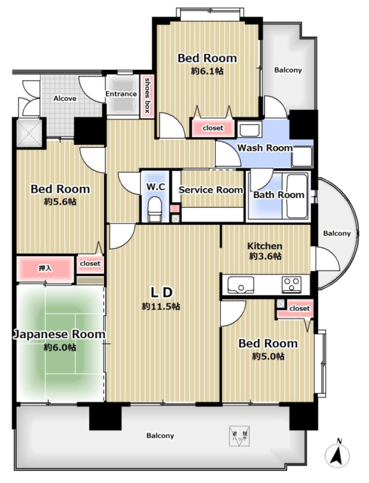 専有面積 | 85.6u | 間取り | 4SLDK (LD11.5/K3.6/洋室6.1/洋室5.6/洋室5/和室6) | ||