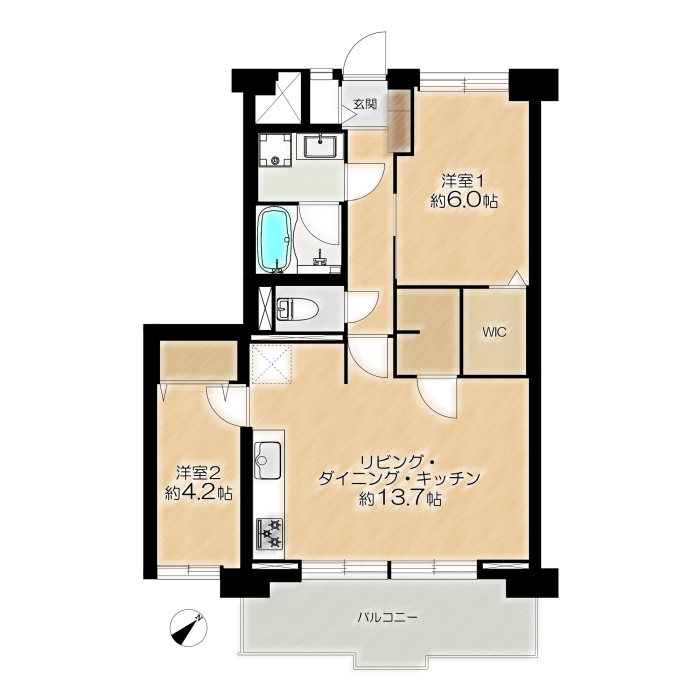 専有面積 58.79u 間取り 2LDK (LDK13.7/洋室6/洋室4.2)