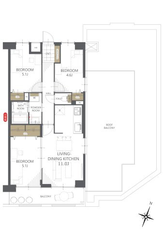 専有面積 | 59.36u | 間取り | 3LDK (LDK11/洋室5.1/洋室5.1/洋室4.6) | ||
