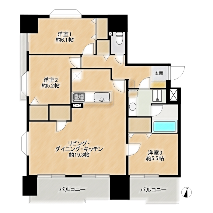 専有面積 | 80.79u | 間取り | 3LDK (LDK19.3/洋室6.1/洋室5.5/洋室5.2) | ||