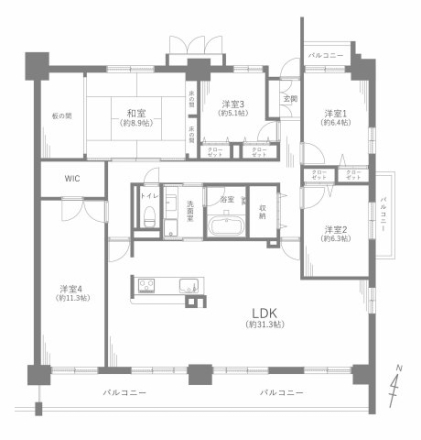 専有面積 | 157.28u | 間取り | 5LDK (LDK31.3/洋室11.3/洋室6.4/洋室6.3/洋室5.1/和室8.9) | ||