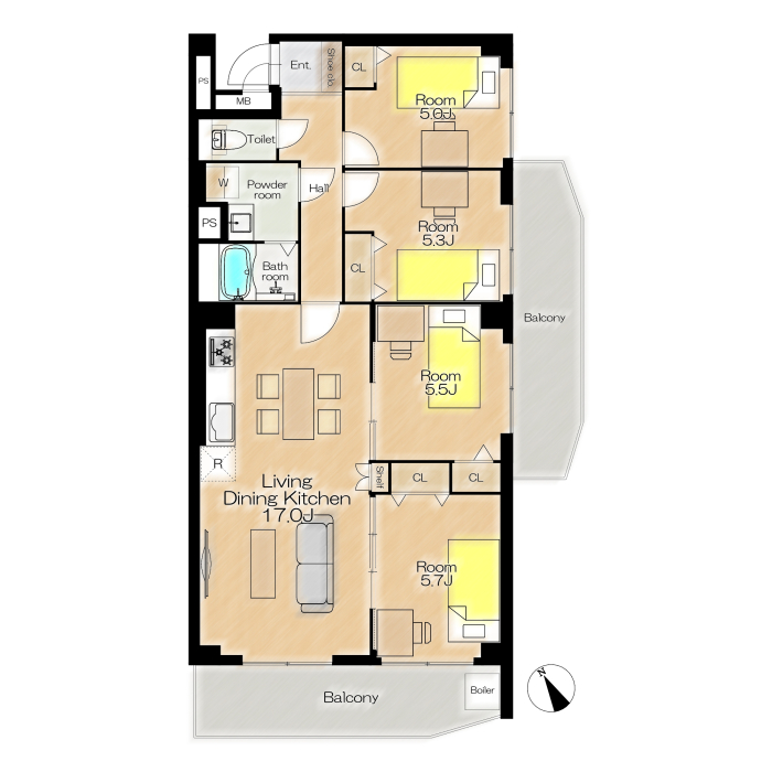 専有面積 | 81.3u | 間取り | 4LDK (LDK17/洋室5.7/洋室5.5/洋室5.3/洋室5) | ||