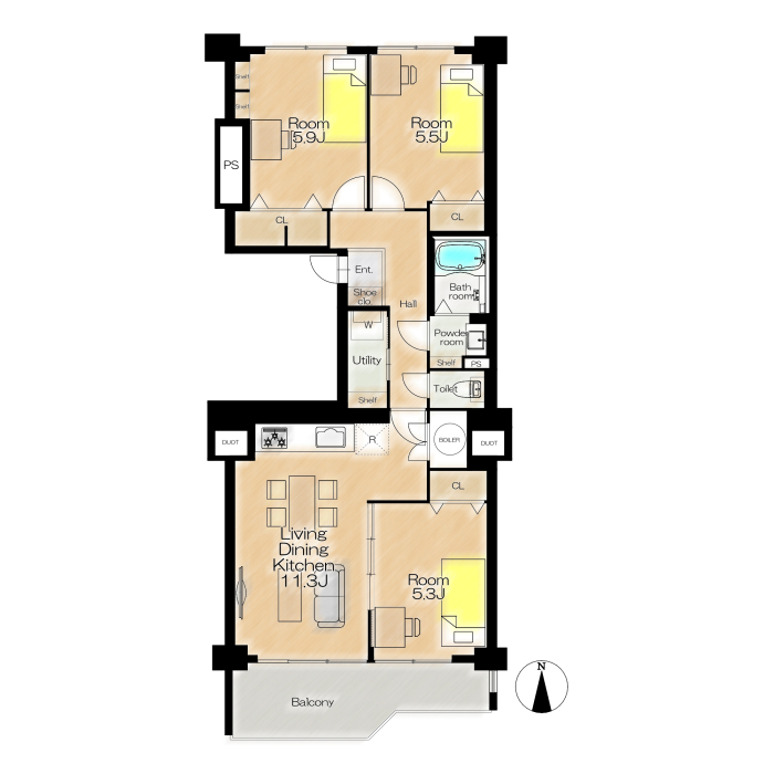 専有面積 70.28u 間取り 3LDK (LDK11.3/洋室5.9/洋室5.5/洋室5.3)