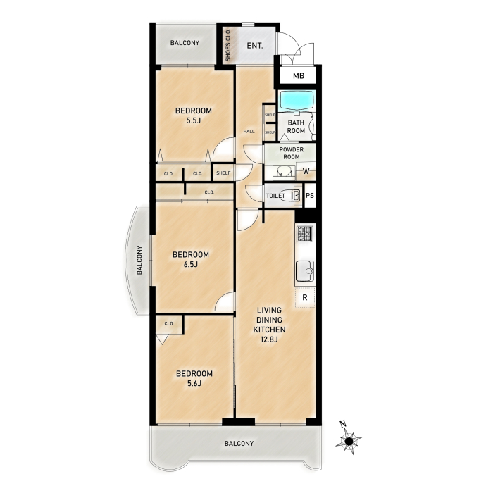 専有面積 71.2u 間取り 3LDK (LDK12.8/洋室6.5/洋室5.6/洋室5.5)