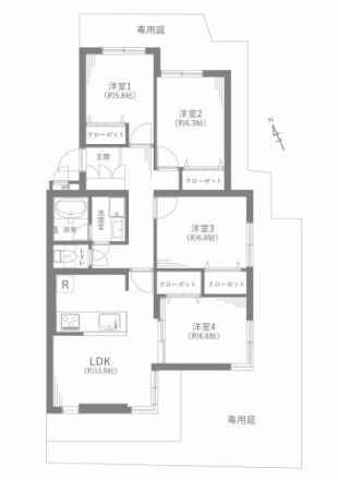 専有面積 | 89.64u | 間取り | 4LDK (LDK13.9/洋室6.8/洋室6.6/洋室6.3/洋室5.8) | ||