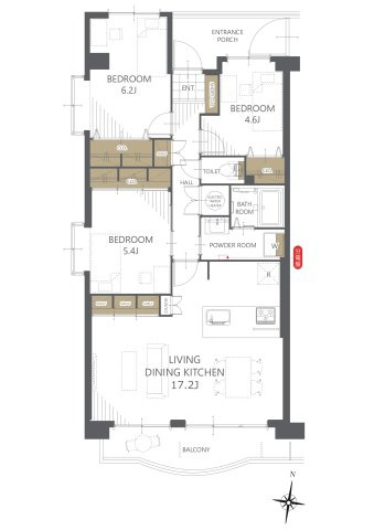 専有面積 77.46u 間取り 3LDK (LDK17.2/洋室6.2/洋室5.4/洋室4.6)
