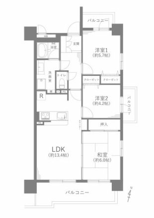 専有面積 66.43u 間取り 3LDK (LDK13.4/洋室5.7/洋室4.2/和室6)